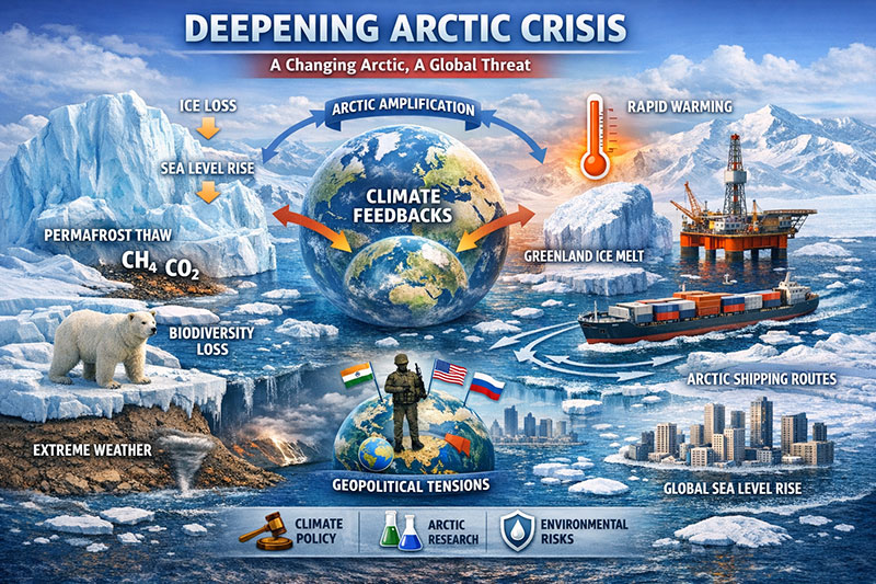 The Arctic crisis has to do with more than just biophysically based concerns; it has to do with social and geopolitical considerations as well. Indigenous populations have to contend with disrupted paths for hunting, shifting patterns of game, and degraded infrastructure due to melting permafrost. Then there’s the shift in ecosystems due to the decline of ice-supported food chains and impacts on fish and biodiversity. Geopolitically, it’s been exacerbated by increased Arctic accessibility, which has led to challenges in maritime transportation routes, strategic defence positioning, and resource development
